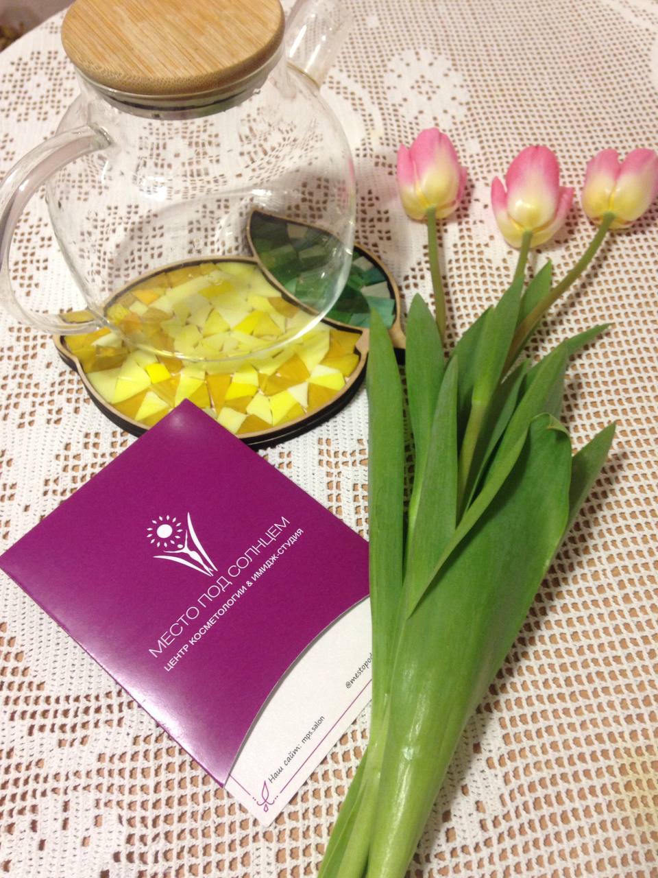 Лариса Кондратьева, мама Лени с ДЦП: "Огромное спасибо за мастер-класс и подарки фонду, студии "Кони в яблоках" и компании "Сибур"! Было интересно, творчески, увлекательно. Спасибо за угощения, все очень вкусно. Свою мозаику пристроила как подставку для чайника. Девочки, с праздником!