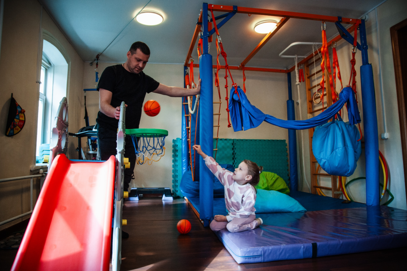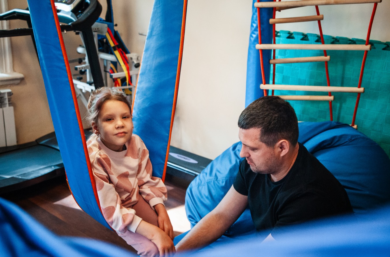 В Школе особенных семей ЛФК проходит индивидуально. Инструктор подстраивается под ребёнка: его темп, самочувствие, настроение. Где-то — мягкое растяжение, где-то — шаги по коврику или броски мячом.